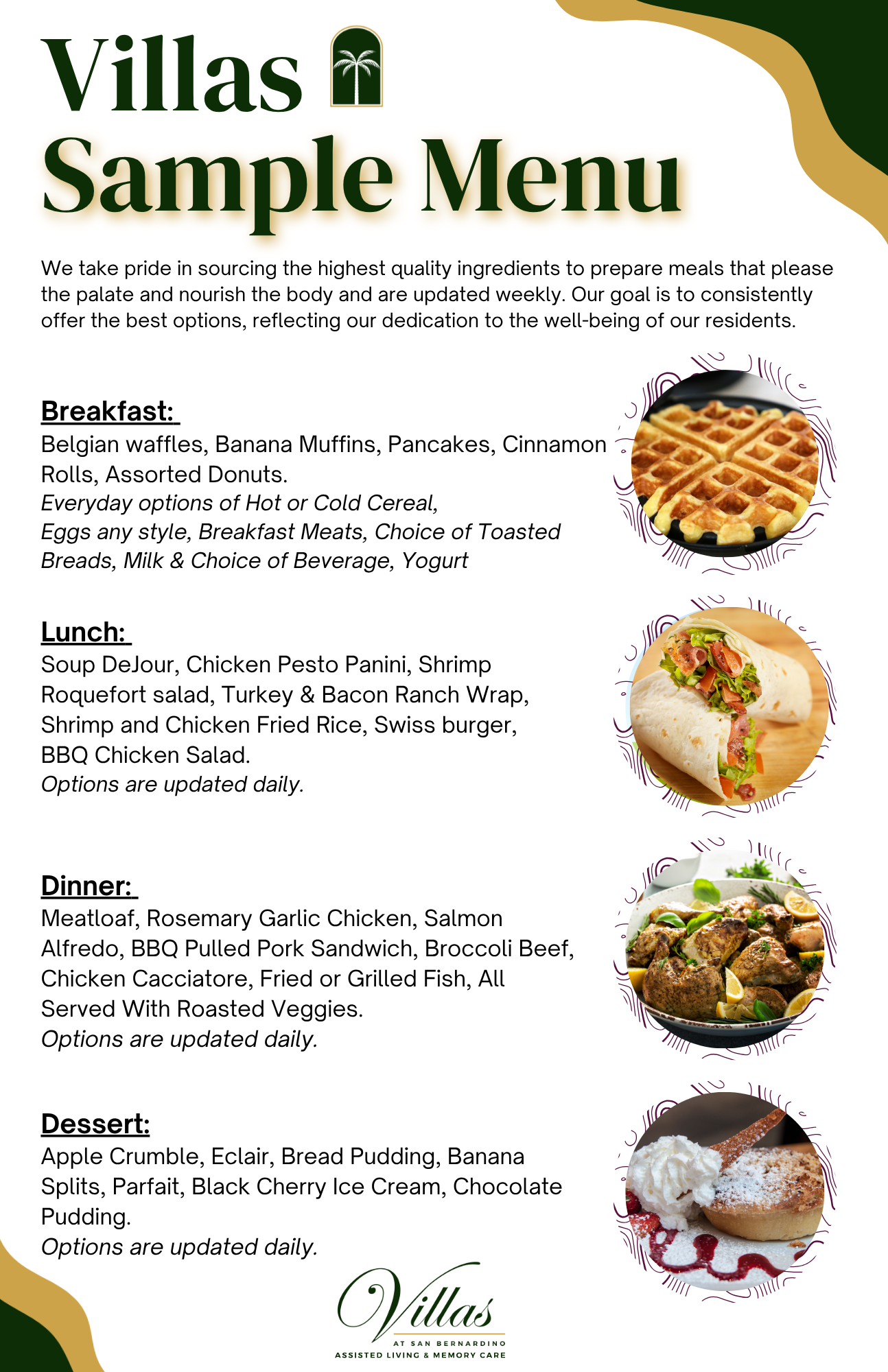 Our residents enjoy personalized dining with a rotating menu of comforting classics and fresh, seasonal dishes, plus occasional international flavors to keep things interesting. Whether it is a hearty stew, a crisp garden salad, or a light, homemade dessert, every meal is prepared with quality ingredients and careful attention to taste, presentation, and nutrition. At Villas at San Bernardino, no one has to choose between delicious and nutritious—they get both.